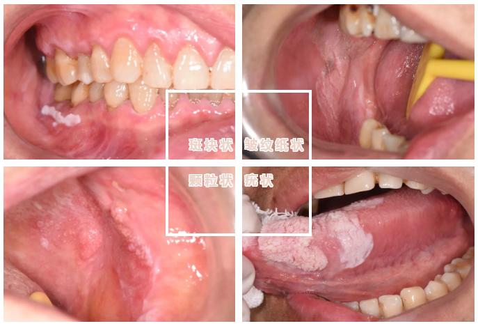 1、 白斑类型:非均质型(颗粒状、疣状),溃疡糜烂型;伴念珠菌或HPV感染;伴上皮异常增生,程度越重者癌变风险越高。